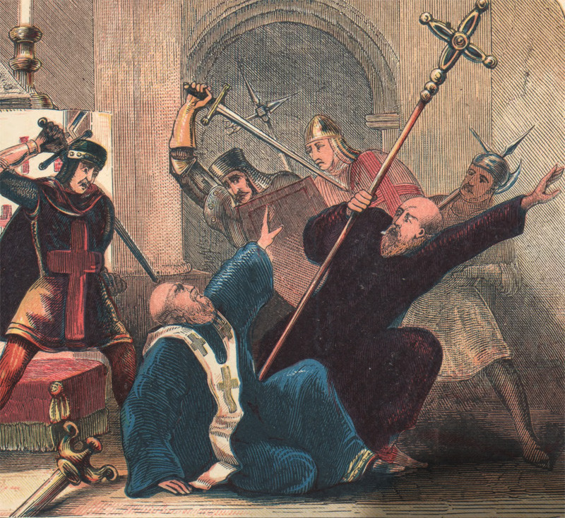 Имена рыцарей известны: Реджинальд Фиц-Урс, Уильям де Траси, Хью де Морвилль и Ричард Брито (приближенные Генриха II, находившиеся при нем в Нормандии в тот вечер, когда он разразился гневной речью в адрес своевольного архиепископа Кентерберийского). Рыцари посчитали это призывом к действию. Сохранилось по меньшей мере пять рассказов очевидцев. Если верить им, то действия рыцарей не были похожи на поведение людей, получивших четкую инструкцию убить Томаса Бекета. Когда воины прибыли в аббатство, они, сложив оружие во дворе, сначала встретились с Бекетом в большом зале обители. Там Реджинальд Фиц-Урс обвинил архиепископа в нарушении соглашения с Генрихом II и заявил, что тот должен отправиться в изгнание, а потом приказал монахам удерживать прелата под стражей, поскольку его должен судить король. Переговоры ни к чему не привели, и рыцари покинули помещение. Вернулись они уже с оружием, но монахи увели архиепископа в собор. В храме воины сперва попытались захватить Бекета, после чего пролилась кровь. Не следует ли из этого, что первоначальная задача была доставить архиепископа к Генриху II для разбирательства, а убийство – импровизация исполнителей из-за личных мотивов?
