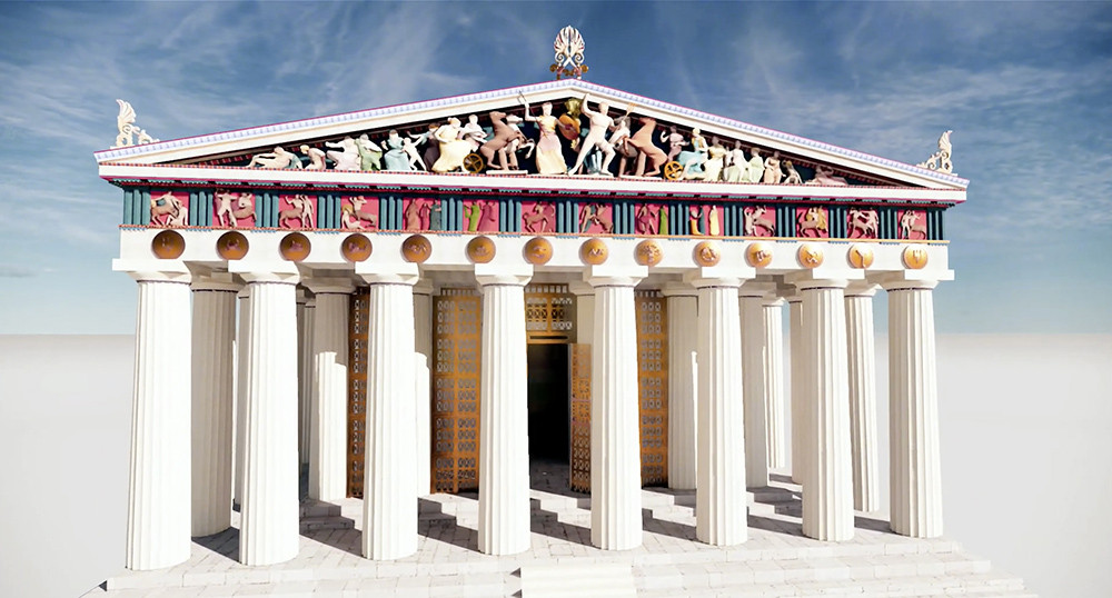 До наших дней афинский Парфенон дошел уже в руинах. Время стерло с фасада не только скульптуры, но и яркие краски. Представить, как все выглядело в Античности, помогает реконструкция