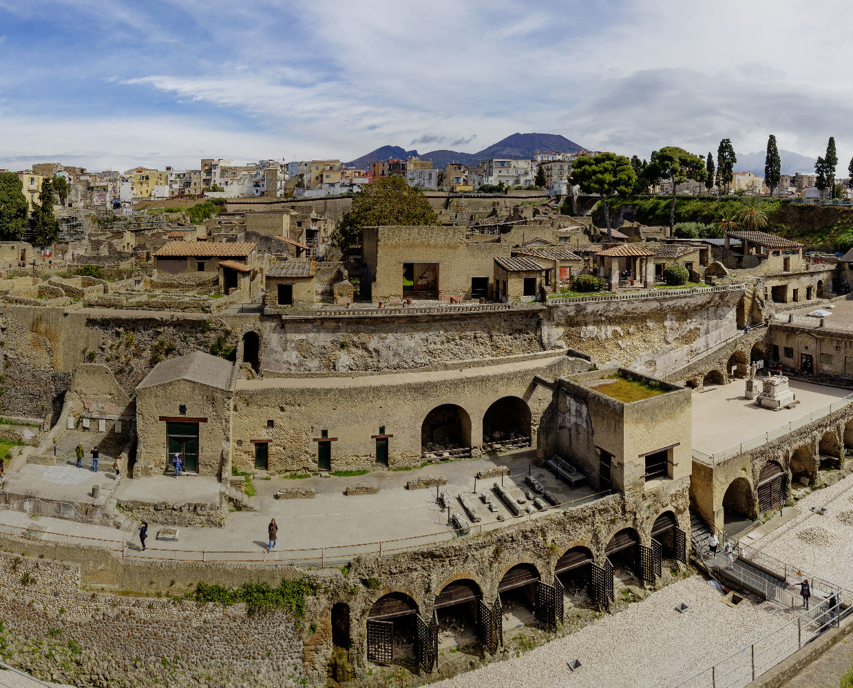 Чтобы попасть в прошлое, я приехала в небольшой город Эрколано на юге Италии. Прохожу в монументальную арку, обозначающую вход в археологическую зону. Зона эта выглядит как огромный котлован прямо посреди застройки современного Эрколано. В котловане видно лишь часть древнего Геркуланума – ее с большим трудом за 200 с лишним лет удалось освободить от толщи окаменевших продуктов извержения вулкана. Остальное скрыто – современные обитатели домов, стоящих вокруг, не торопятся жертвовать жильем ради новых раскопок.