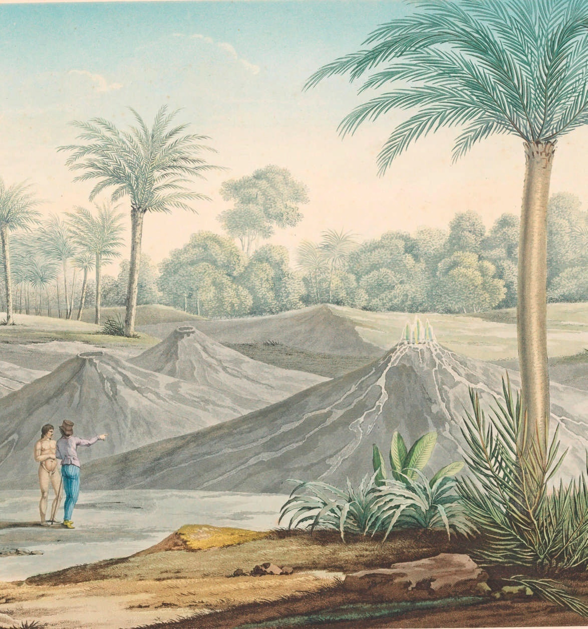 В окрестностях Турбако, откуда видна громадная снеговая гора Санта-Марта, в средине пустынного места, окруженного первобытными лесами, выдаются около 20 грязных вулканов, которые в 1801 году на месте описывал сам Александр Гумбольдт. Самый большой конус черно-серого суглинка вышиной до 3 саж., а в основании около 11 сажен в диаметре; на вершине каждого конуса круглое отверстие от 5 до 6 дюймов или от 3 до 3 1/2 вершков в диаметре, окруженное иловатой стенкой, быстро выбрасывает к верху газ большими пузырями. Верхняя часть воронки наполнена водой, которая стоит на толстом слое ила, и извержения следуют довольно правильно, пять раз каждые две минуты, причем замечено наблюдателями, что в одно и то же время в соседних конусах извержений не бывает. Если наклониться к отверстию маленького кратера, то каждые 20 секунд извержения слышится глухой шум внутри земли, в глубине, под основанием конусов.
