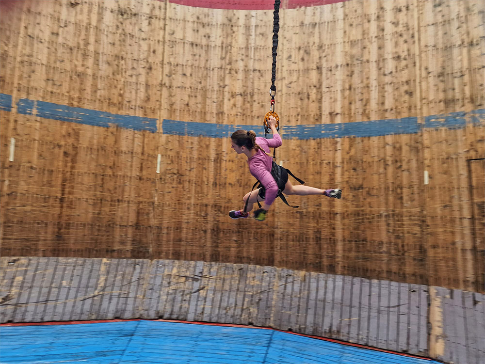 В аттракционе «стена смерти» мотоциклист едет по вертикальной цилиндрической стене, не соскальзывая вниз благодаря скорости. Бежать с такой скоростью невозможно. Но на Луне с ее вшестеро меньшей гравитацией бегуну хватит прыти, решили ученые. Бегающие по стенам колонисты смогут поддерживать себя в форме без тренажеров. Экспериментаторы арендовали «Стену смерти» и подвесили испытуемых на гибких лентах, компенсирующих 5/6 их веса. Участники оправдали надежды, пробежав несколько кругов по вертикальной стене со скоростью 5–7 м/с.