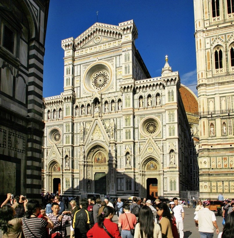 У входа в базилику Санта-Кроче посетителей встречает памятник Данте Алигьери. И очередь. Чтобы попасть внутрь церкви, хоть пять минут, но отстоять придется. Вот и я пристраиваюсь за вереницей туристов из разных стран, в ожидании любуясь беломраморным фасадом величественного храма. Изнутри он кажется еще больше и величавее. Живопись Джотто и Вазари, скульптуры Донателло и Росселино… Но не столько внутреннее убранство и шедевры изобразительного искусства влекут в базилику многочисленных посетителей, сколько возможность прикоснуться к гробницам гениев. Санта-Кроче называют Храмом итальянской славы: здесь покоится прах выдающихся флорентийцев, признанных во всем мире художников, ученых, поэтов, политиков — в основном эпохи Возрождения.