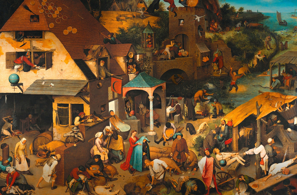 На этом фоне Брейгель и пишет «Фламандские пословицы» или «Мир вверх дном». На первый взгляд, это небольшая картина (117 см на 164 см) с жанровыми сценками из жизни крестьян, но на самом деле, это визуализация фламандских пословиц и поговорок. Современники художника без труда расшифровывали его послание, а нынешние исследователи смогли идентифицировать не все. Хотя даже в нашей культуре присутствуют свои аналоги этих фламандских изречений.