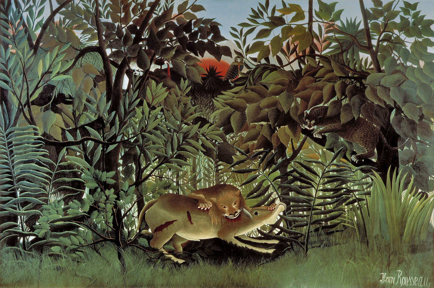 Живописью Руссо всерьез увлекся, когда ему было уже около 40 лет, и тема джунглей захватила его творческое воображение не сразу. Но с 1891 года художник создал более двадцати картин, где действие происходит среди буйной тропической растительности. Огромное полотно «Голодный лев бросается на антилопу» Руссо показал публике на знаменитом Осеннем салоне 1905–го – на той самой выставке, после которой группу молодых художников, смело обращавшихся с цветом и формой, прозвали «фовистами», от слова fauve – «дикий зверь». «Донателло среди диких зверей», – так охарактеризовал критик Луи Воксель скульптуру Альбера Марке в окружении полотен Анри Матисса, Мориса де Вламинка, Андре Дерена и других. Картина Руссо висела рядом с ними, и хотя к течению фовистов художник не принадлежал, есть версия, что именно его сцена в джунглях в сочетании с необычной манерой исполнения навеяла искусствоведу такую ассоциацию.