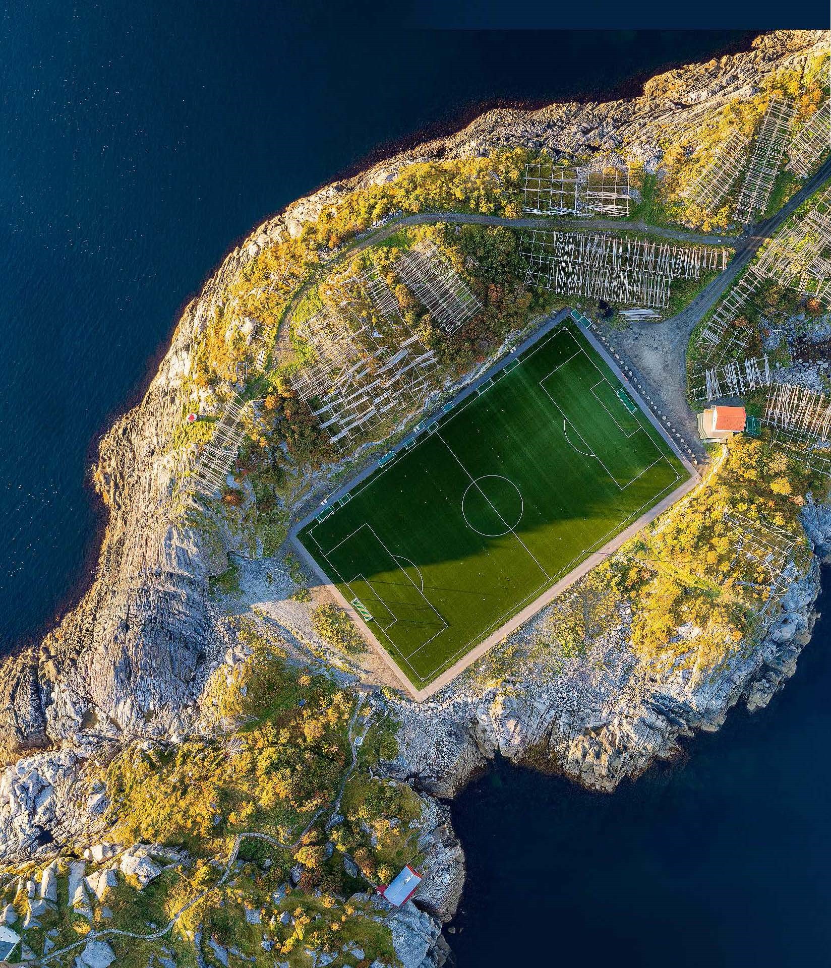 Рыбацкая деревня Хеннингсвер на Лофотенах — место художественное: кругом вода, скалистые острова и монументальные сушильни для трески. При населении менее 500 человек: три арт-галереи, свой футбольный клуб и потрясающий стадион, похожий на арт-объект. Для его сооружения на скале выровняли площадку и устлали ее искусственным торфом.