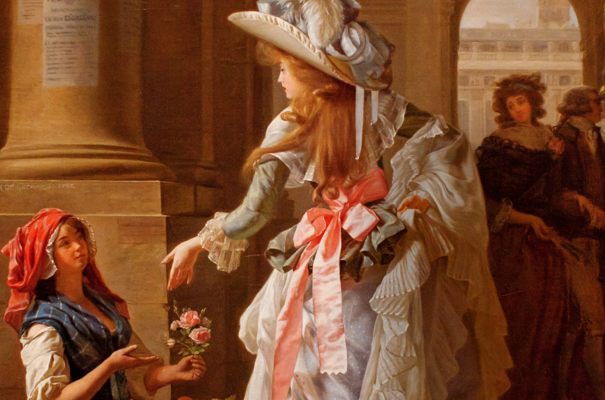 В то время как карикатуристы вовсю потешались над тогдашней женской модой, художник-жанрист Мишель Гарнье накануне Великой французской революции писал невинные бытовые сцены с участием нарядных красавиц. Но надвигавшиеся перемены отразились и на его полотне. Наряд щеголихи, покупающей цветы в одном из первых европейских «шопинг-моллов» и всем своим видом демонстрирующей достаток и праздность, выглядит избыточно и гротескно рядом с простой одеждой торговки. Красавица высокомерно расплачивается за букет в 1787-м, в самое межвременье. Через два года начнется Великая французская революция, которая за несколько лет вместе со старым порядком сметет напудренные прически и необъятные юбки. Уцелевшим дворянам станет небезопасно обращаться к знаменитым куаферам и носить дорогие одежды броских цветов. Постепенно утвердится принципиально новая мода на платья простого силуэта, напоминающие древнегреческие хитоны, и туфли на плоской подошве. Правда, и тогда найдутся любительницы довести любой фасон до крайности; этих экстравагантных женщин прозовут мервейезами – «причудницами», а их спутников-щеголей инкруаяблями – «невероятными».