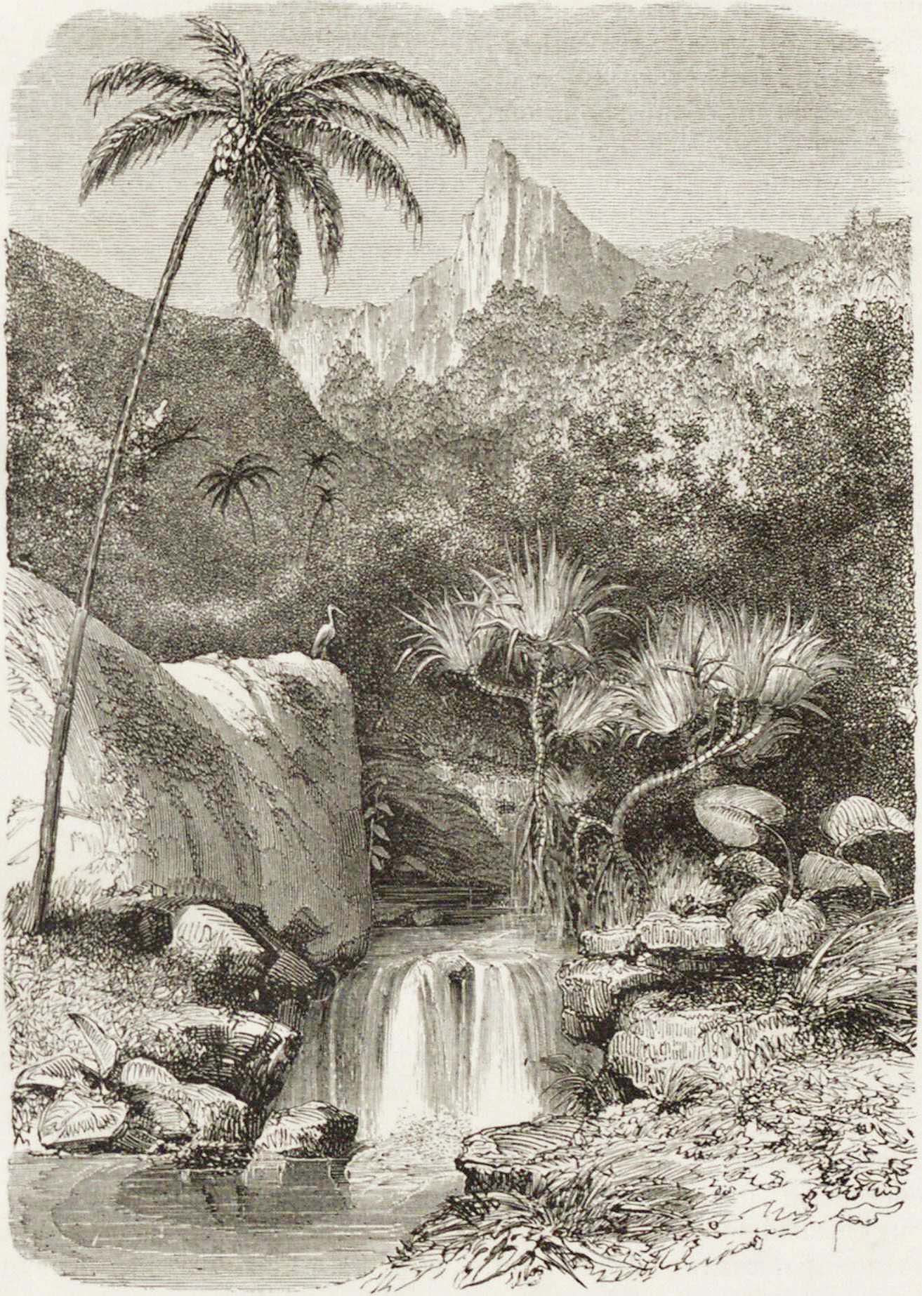 Вид с моря на эту группу островов совершенно очарователен. Остроконечные вершины гор там и там рисуются в воздухе, как готические башни; одна из таких вершин загнута, как птичий клюв, и потому получила название Клюв-попугая (Pico de Papagaio). Северная часть острова покрыта пригорками и холмами со множеством ручейков и водопадов; на южной стороне выдаются красивые, покатые, покрытые густым лесом гранитные горы, с ясными признаками потухшего вулкана; из выброшенных вулканом камней жители строят себе дома. Между всех островов, один главный, и самый большой, остров Св. Антония, имеет в длину 30, а в ширину 42 верст и до десяти тысяч жителей. Жители всех островов, белые, черные и мулаты, сосредоточены почти на одном острове Св. Антония; тут живет губернатор и чиновники португальского правительства. Столица, Сн. Антонио, небольшой, красивый городок, построен в глубине небольшой песчаной бухты, между двух речек: Рио-дос-Фрадос на северо-востоке и Попугаевой реки на юго-западе; обе речки параллельно текут по последним покатостям горного хребта. Климат Принцевых островов очень жаркий, сырой и нездоровый. Самые сухие месяцы считаются июль и август; а дождливая погода начинается в конце сентября и продолжается до марта. Главные произведения земли: кофе, какао, корица, гвоздика и черный перец. Разные сорты плодовых дерев и овощи разводятся с большим успехом. На Принцевых островах много строевого лесу и других великолепных и роскошных растений. Прилагаемый рисунок показывает, как роскошн