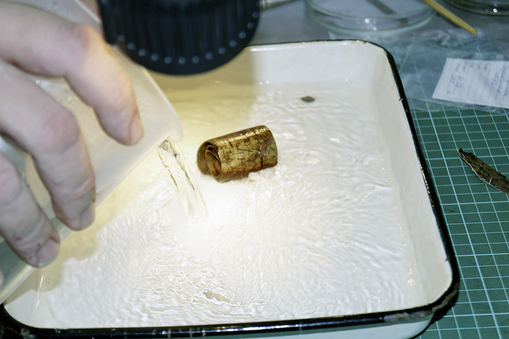 На раскопе грамоту для сохранности сразу помещают в сосуд с водой. Если этого не сделать, береста высохнет раньше времени, потрескается, станет жесткой, и развернуть ее без повреждений будет невозможно. В сосуде с водой грамота может храниться несколько дней, но обычно развернуть ее стараются сразу. Разворачивают грамоты в камеральной лаборатории – отдельном помещении, где работают с археологическими находками.