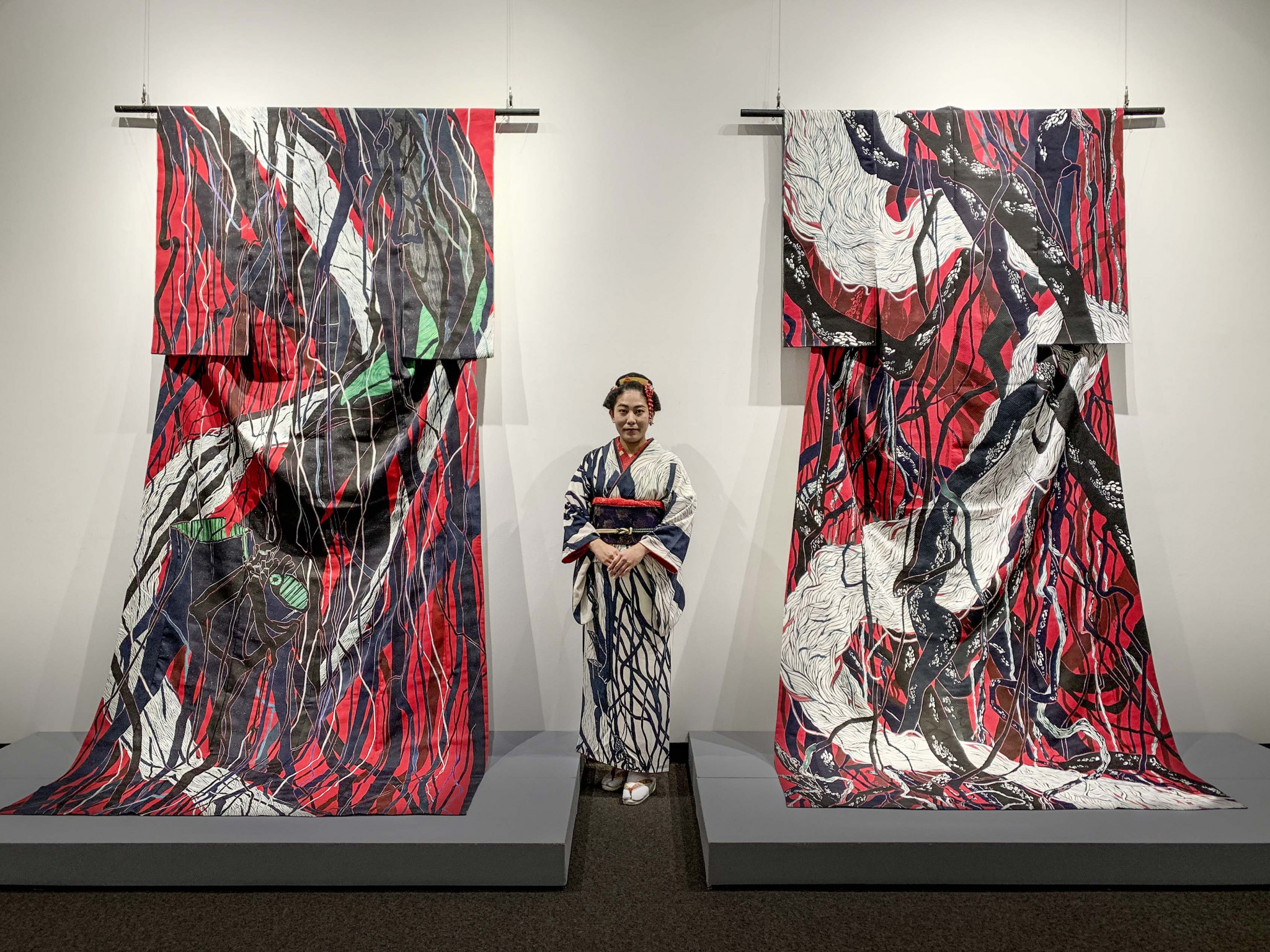 Традиционный покрой кимоно, традиционная технология росписи, традиционные материалы, мифологические сюжеты – из этих компонентов художница с японского острова Окинава создает нечто новое