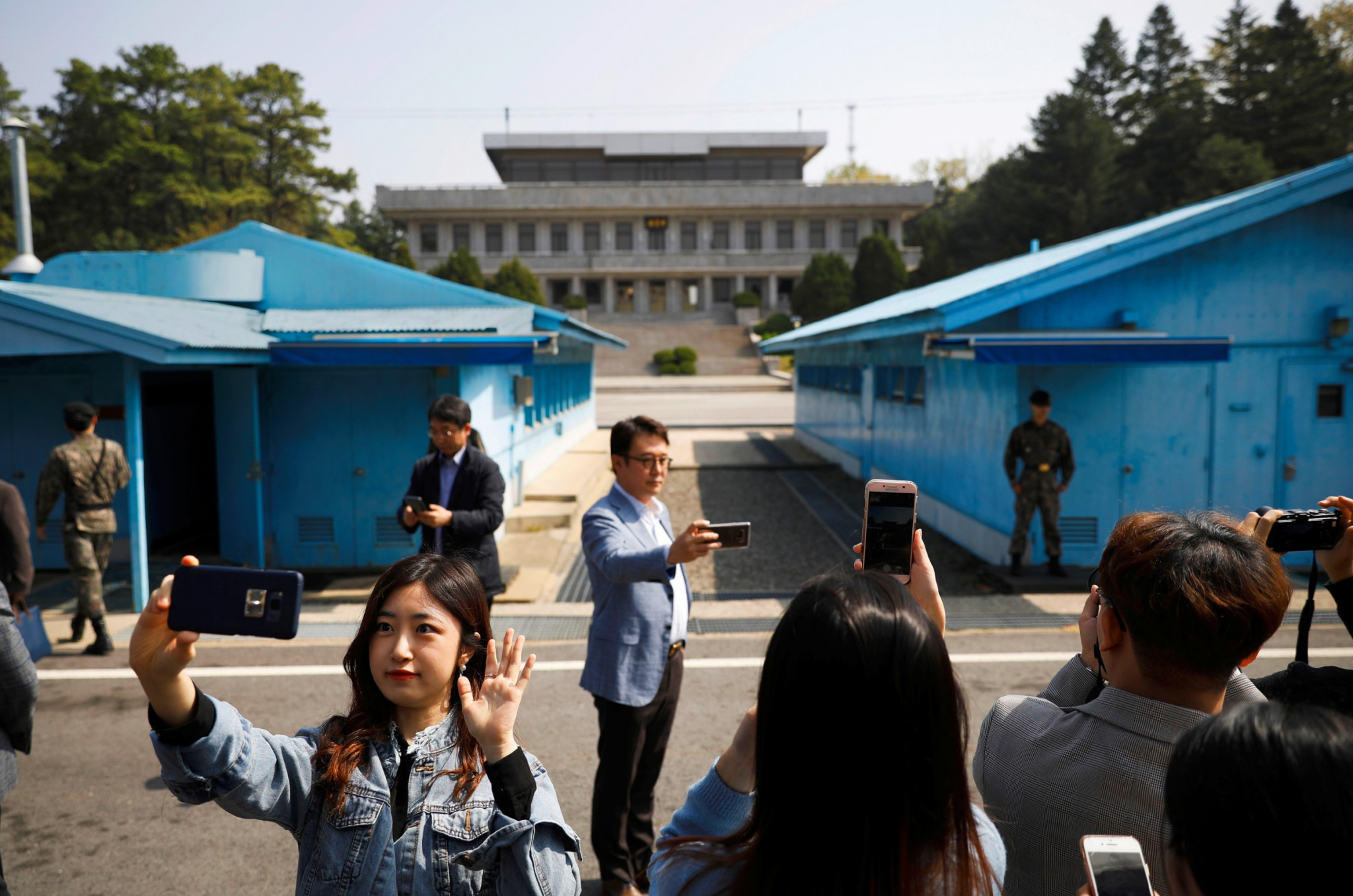 Демилитаризованную зону (ДМЗ) создали в 1953 году как буфер между Северной и Южной Кореей. По центру этой полосы длиной 250 км и шириной 4 км проходит Военная демаркационная линия, обозначенная столбиками с табличками. В западной части ДМЗ, в местечке Пханмунджом, находится так называемая Объединенная зона безопасности, ограниченная колючей проволокой. Там проводят встречи и переговоры. Туда же пускают туристов, увлеченно делающих селфи.