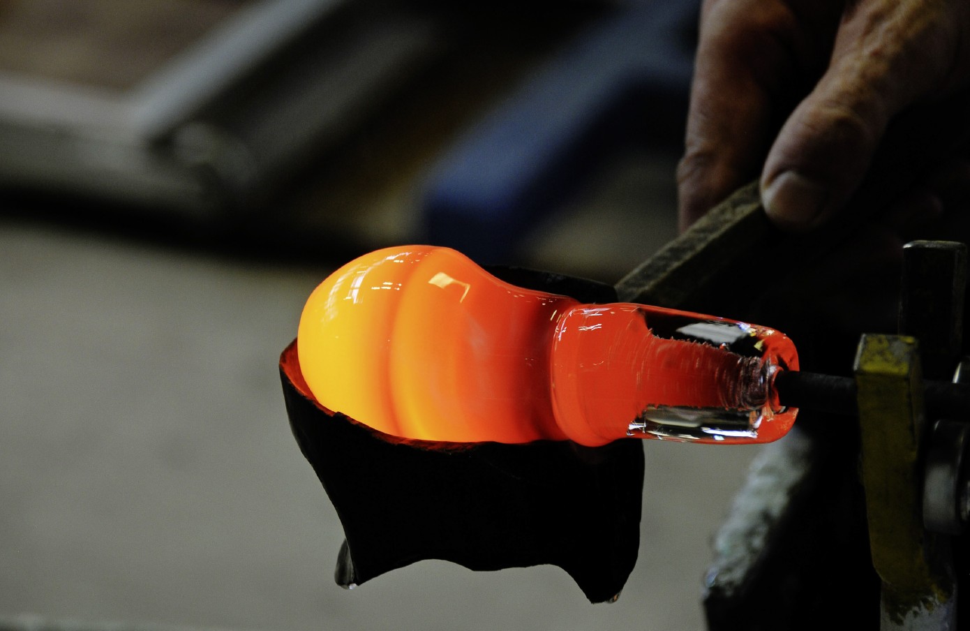 В помещении просторно, светло и на удивление малолюдно. На деревянном помосте в глубине цеха работает несколько стеклодувов в шортах и легких рубашках — жарко. Полыхает оранжевое пламя в жерлах печей, где плавится хрустальная масса, слышится плеск воды, которой подмастерья поливают стоящие у помоста деревянные формы. Мастер дует в длинную трубку, крутя ее в руках. На конце трубки постепенно увеличивается яркий шар стеклянной массы. Стеклодув изготавливает внешний, цветной слой хрустального изделия. Внутри этого слоя будет обычный прозрачный. Данная технология позволяет создавать прозрачный узор, прорезая цветной слой. Именно такой, накладной хрусталь — основная продукция завода.