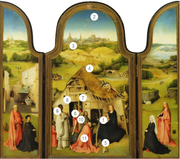 Босх, «изъяснявшийся» на нескольких символических языках позднего Средневековья, использовал, по мнению искусствоведов, и алхимические визуальные коды. Некоторые исследователи считают, что художник выставил алхимиков, которых порой подозревали в ереси и подделке монет, в дурном свете с помощью их же символики. Другие сомневаются, что Босх так разбирался бы в искусстве, которое не одобрял. Алхимические образы для него — еще один символический язык, дающий новое измерение, например, евангельской истории о волхвах, которые пришли поклониться новорожденному Иисусу как будущему Царю Иудейскому.