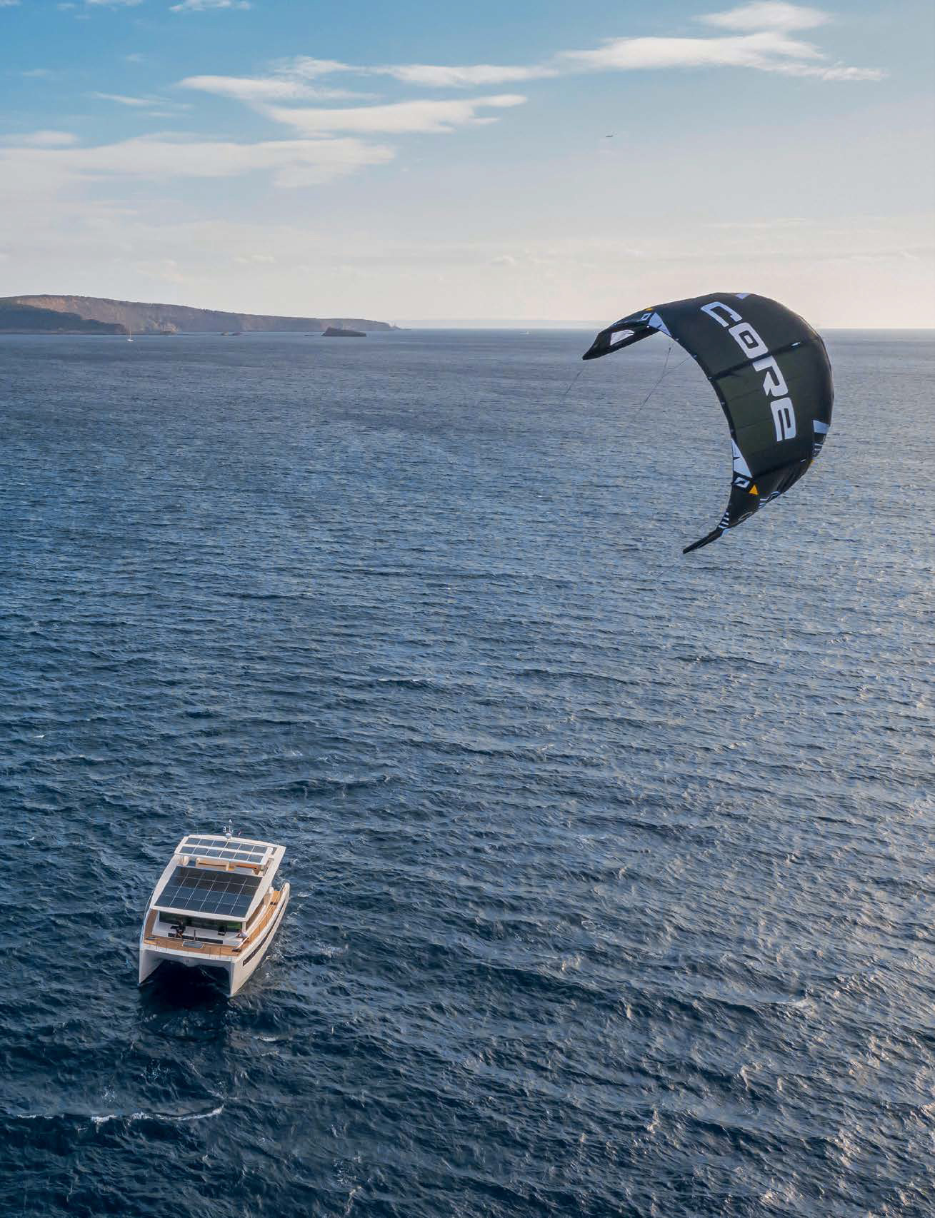 Отмеченный несколькими наградами электрический катамаран Silent 60 показали еще в 2021 году, однако до каннской выставки он добрался лишь в этом сезоне. За два года австрийская верфь Silent Yachts построила четыре лодки, успев существенно доработать дебютную модель, и сейчас в производстве находятся еще 11 корпусов. Модель интересна рынку в первую очередь возможностью бесшумного электродвижения на солнечной энергии и тем, что это первая серийная яхта, для которой в качестве опционального движителя предлагают кайт. Сама по себе идея не нова, и ее развивают в приложении к торговому флоту. Известно 5–6 прогулочных судов с кайтом, но все это пока не серийные, построенные в единственном экземпляре суда.