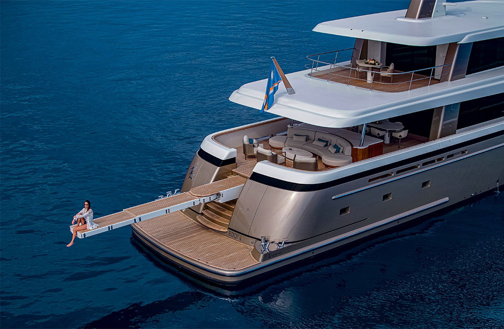 Внешним обликом трехпалубной экспедиционной яхты Lady Lene занималась команда Гвидо де Грута. Как рассказывал сам известный дизайнер, заказчик — давний и постоянный клиент Van der Valk — задал довольно сложную задачу, выдвинув ряд весьма специфических требований, в том числе в отношении высоты помещений и их доступности (об этом дальше). Когда эти моменты были определены на чертежах общего расположения, дизайнеры смогли приступить к разработке экстерьера. Но и здесь у будущего владельца были пожелания относительно носовой оконечности, формообразующих линий, открытой кормовой палубы и пр.