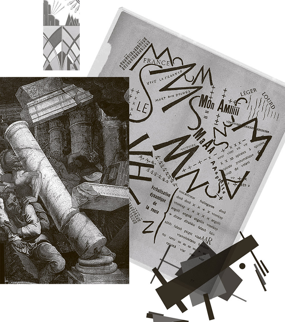 Ключом к пониманию ар деко могут служить строки из «Бесплодной земли» Т. С. Элиота: «…ибо узрел // Лишь груду поверженных образов». Это образ культуры, пережившей Первую мировую войну, и все, что она могла создать из этой груды, – античных богов и архитектурных ордеров, благородных дикарей и прав человека и гражданина, – было коллажем. Современный французский философ Жан-Марк Лашо описывает создание коллажа как деконструкцию, сменяющуюся реконструкцией: «Первый ход: художник находит и отбирает в самой действительности совокупность разрозненных кусков. <…> Второй ход: он собирает (не заботясь о предустановленном порядке) и соотносит (конфликтным способом) части головоломки. <…> Вырванные из привычного мира осколки реальности включаются в подвижную структуру, не утрачивая при этом исходных свойств и памяти. Сопротивляясь манипуляциям художника и сохраняя относительную автономность, они вместе с тем выпадают из контекста»1.