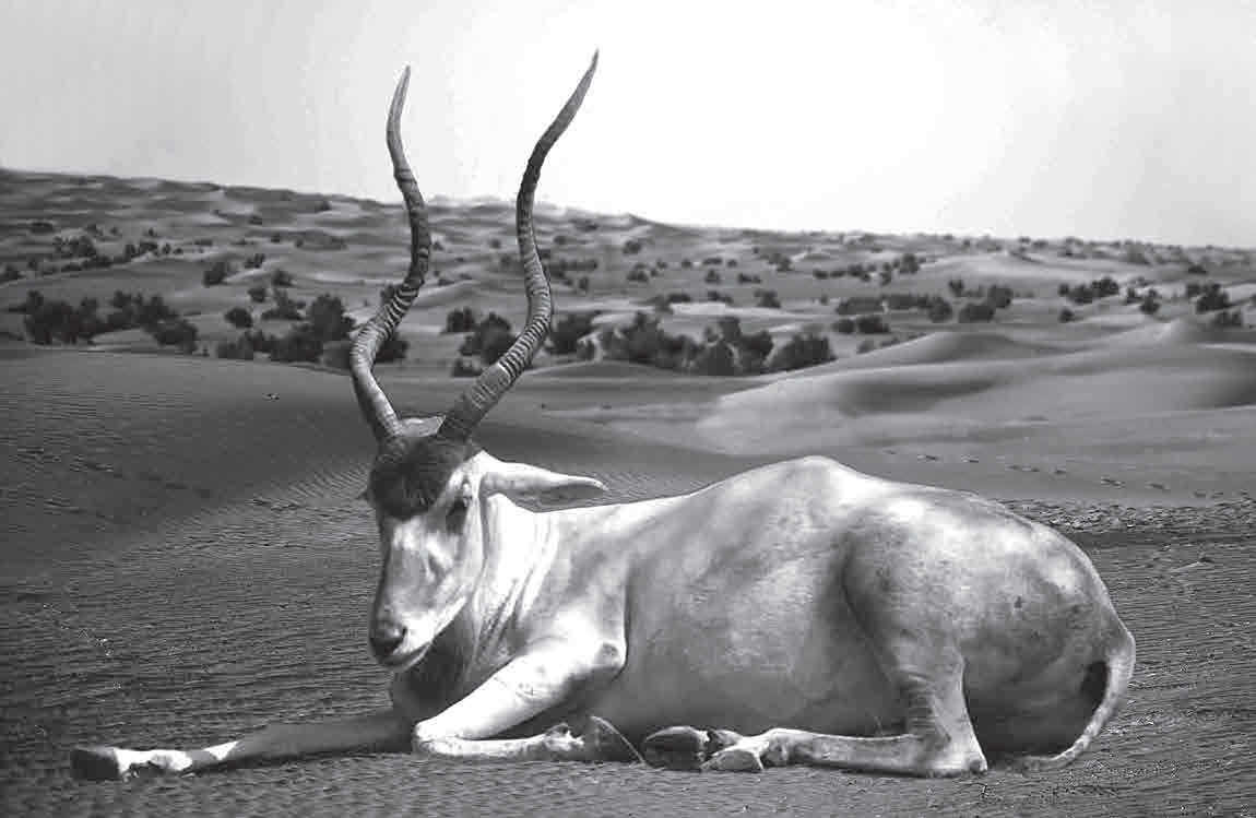 Но вот по пологим дюнам, оставляя после себя двойные следы, бредет пятерка каких-то светлых животных. Позади них идет белоснежный красавец-бык с огромными витыми, спирально закрученными рогами. Время от времени он останавливается и оглядывает этот пустынный пейзаж, видимо, ожидая нападения, затем снова пускается в путь, догоняя свой гарем, по бесконечным песчаным дюнам…