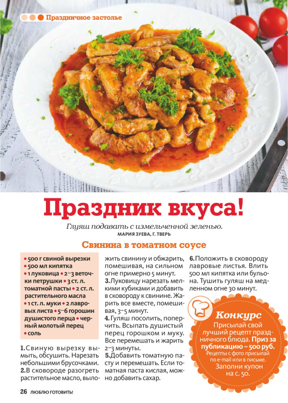 «Добрые советы. Люблю готовить!» — журнал о вкусной еде, не похожий на другие кулинарные издания. Все опубликованные в нем рецепты присланы в редакцию самими читателями. Каждый рецепт прошел конкурсный отбор, а его автор получил денежный приз. Ежемесячно на страницах журнала — более 100 коронных блюд, которые многократно проверены опытными хозяйками и которые можно смело брать в свою коллекцию рецептов тем, кто любит баловать родных и удивлять гостей. С помощью журнала легко составить меню полноценного обеда или приготовить ужин на скорую руку, соблюдать пост или устраивать пышные застолья. А еще — в совершенстве овладеть кулинарным искусством под руководством шеф-повара, который дает в каждом номере несколько мастер-классов!